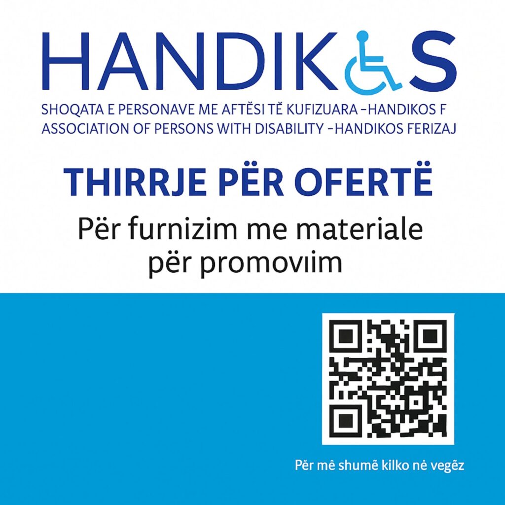 Shoqata e Personave me Aftësi të Kufizuara – Handikos Ferizaj, shpreh interesimin për të lidhur një kontratë kornizë një (1) vjeçare për furnizim me materiale për zhvillimin e aktiviteteve